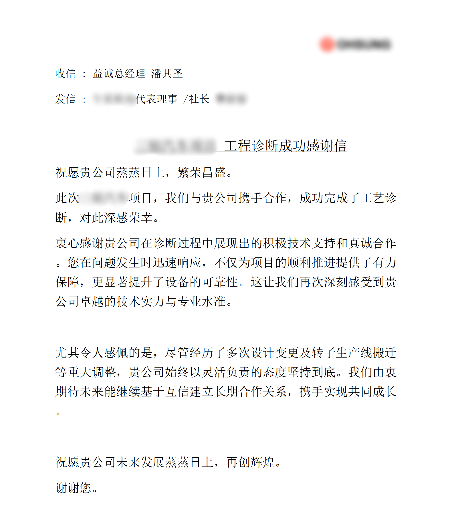 該客戶是韓國汽車配件與電子電器零部件制造領(lǐng)域的行業(yè)巨頭,業(yè)務(wù)遍布全球。作為多次合作的老客戶,此次獲得其官方認(rèn)可,不僅是對益誠技術(shù)與服務(wù)的再次強力印證,更證明了我們具備持續(xù)服務(wù)全球高端制造網(wǎng)絡(luò)的能力,為雙方未來的深度合作注入了更強信心。